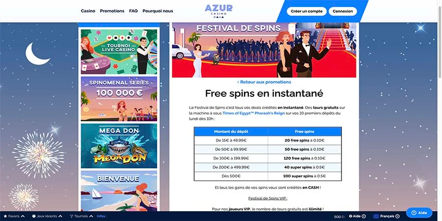 Chaque semaine, les membres du cercle VIP du casino Azur auront accès à un cashback de 10 % sur leurs pertes de la semaine précédente. Ce remboursement sera calculé sur la base de vos dépôts effectués, de vos retraits et des bonus. Le montant sera crédité en argent bonus, et doit être misé au moins une fois pour être retirable.