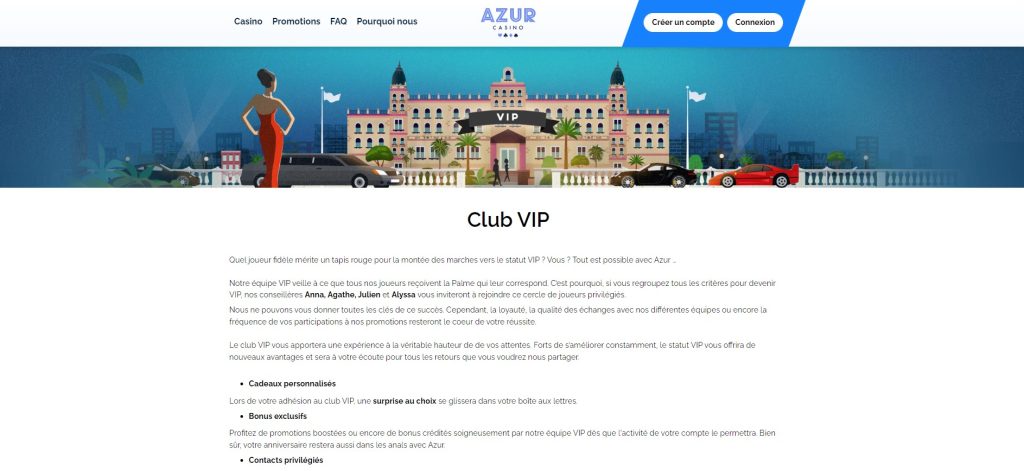 Azur casino a dédié 4 responsables à sa clientèle VIP : Agathe, Alyssa, Pedro et Julien. Ces quatre collaborateurs seront là pour répondre à vos questions, résoudre vos problèmes, et prendre en compte vos remarques par rapport aux services du site. Ils sont disponibles 7 j/7 de 9 h à 18 h.
