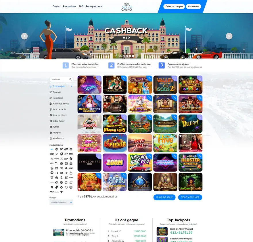 Depuis le lancement de ses activités en 2017, Azur est considéré comme l’une des plateformes de jeux les plus généreux du moment. En effet, ce site se démarque non seulement de ses concurrents par sa large ludothèque (plus de 6000 jeux variés), mais surtout par ses bonus et son programme VIP.